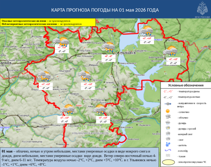 1 мая в Ульяновской области облачно, ночью и утром небольшие, местами умеренные осадки в виде мокрого снега и дождя, днем небольшие, местами умеренные осадки виде дождя. Ветер северо-восточный ночью 4-9 м/с, днем 6-11 м/с. Температура воздуха ночью -2°С, +2°С, днем +5°С, +10°С. в г. Ульяновск ночью -1°С, +1°С, днем +6°С, +8°С.