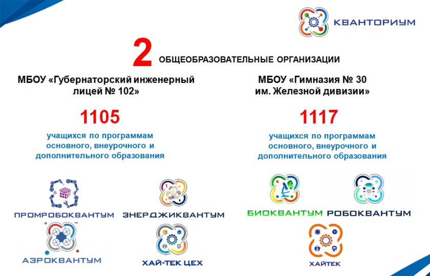 Сейчас в городе действуют два «Кванториума» – в Губернаторском инженерном лицее №102 и в гимназии №30. Их партнёрами являются промышленные предприятия и высшие учебные заведения.