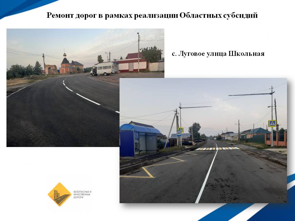 Дополнительно, благодаря субсидиям областного правительства приведены в порядок улица Школьная в Луговом, Димитрова, участки проспектов Антонова и Аполлона Сысцова, перекрёсток 14-го, 14.1 и 14.2 проездов Инженерных, подъездная дорога к СНТ «Импульс». На 90% готова улица Шолмова, на 40% – улица Школьная в селе Лаишевка.