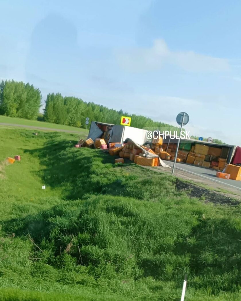 Сегодня, 14 мая, по дороге из Ульяновска в Татарстан перевернулась фура. Об этом сообщают очевидцы. Груз, который перевозила фура, разбросало по всей дороге.