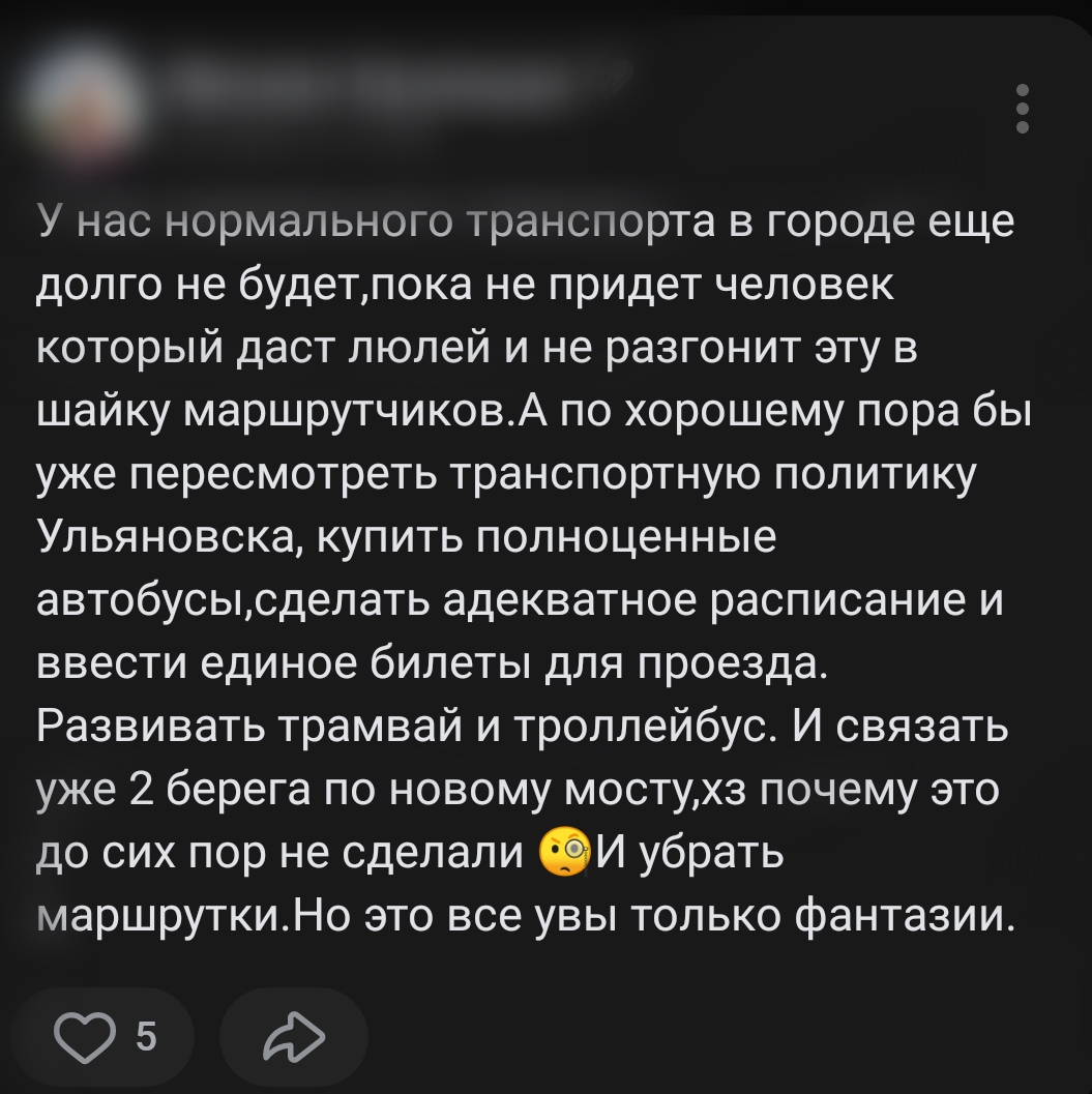 Решить проблему общественного транспорта можно, достаточно посмотреть на соседние регионы: Казань, Самару. Дождутся ли ульяновцы того дня, когда городской транспорт будет приносить лишь позитивные эмоции? Поживем, увидим.