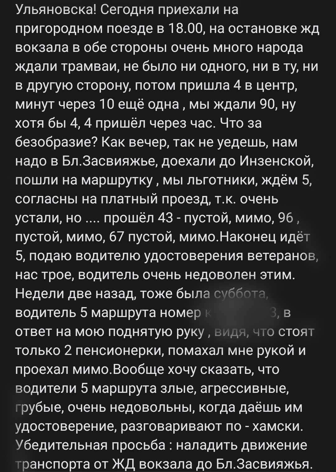 Отметим, что волна жалоб на общественный транспорт поднялась ещё в конце июня. Именно тогда, по словам ульяновцев, маршрутки и трамваи стали ходить с перебоями. В час пик все забито, а вечером и вовсе на дорогах ни одной газели. Вот, что ещё пишут в сети.