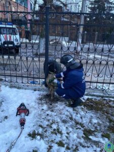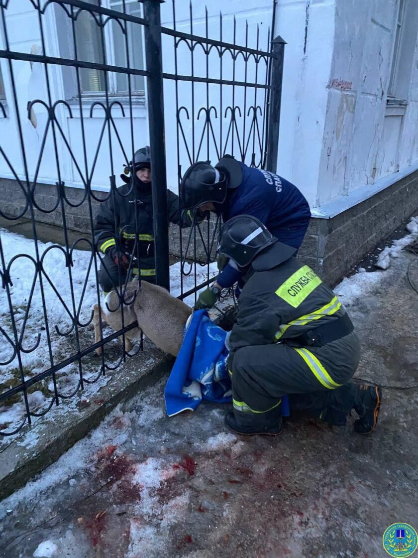 поступило сообщение, что в металлическом заборе около НОЦ детский сад «У Знайка» по ул. Корюкина 2 обнаружена косуля. На помощь застрявшему животному выехали спасатели поисково-спасательной службы МБУ “Управление гражданской защиты г. Ульяновска”.