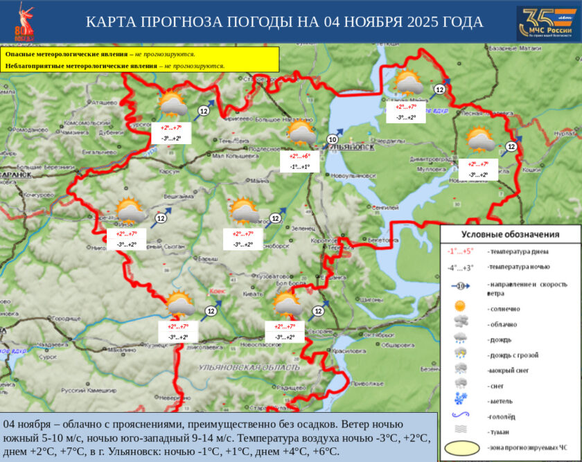 По прогнозу Гидрометцентра, 4 ноября в Ульяновской области ожидается облачная с прояснениями погода, преимущественно без осадков. Ветер ночью южный 5-10 м/с, ночью юго-западный 9-14 м/с. Температура воздуха ночью -3°С, +2°С, днем +2°С, +7°С, в Ульяновске ночью -1°C, +1°C, днем +4°C, +6°C.