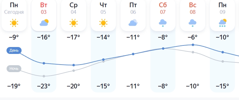 Сервис «Яндекс.погода» сообщает, что сегодня, 2 февраля, еще прогнозируется небольшой снег, при этом столбик термометра опустится ниже, чем в предыдущие дни.